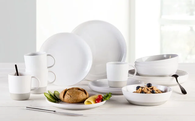 4 Henkelbecher (350 ml), 4 Schale (Ø 17,7 cm), 4 Dessertteller (Ø 21,2 cm), 4 Essteller (Ø 25 cm)