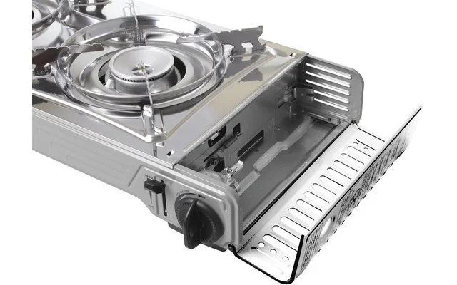 Zweiflammiger Gaskocher mit Aluguss-Grillplatte, integrierter Piezozündung und zwei Aluminium-Brennern. Gaszufuhr regelbar. Ohne Zündsicherung.
