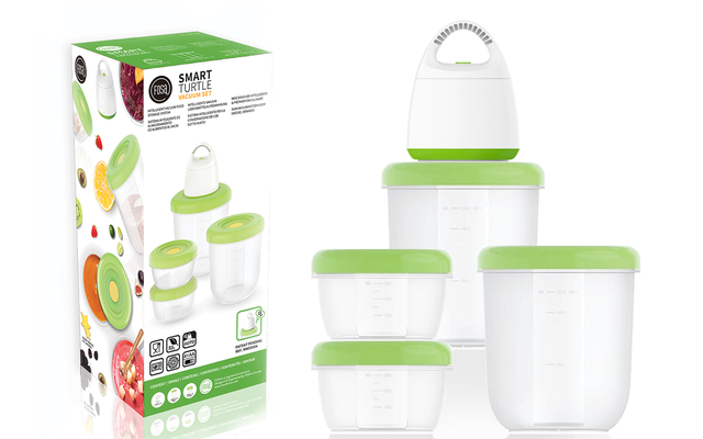 Darüber hinaus sind Im Vakuum spezielle Zubereitungen möglich, w.z.B. schnelles marinieren von Fleisch oder schnelles Quellen von Getreiden, Erbsen, Linsen und Reis ist auch in Verbindung mit dem TURTLE+ möglich. Am besten gleich ausprobieren! Das durchdachte, stapelbare Design ermöglicht eine platzsparende und übersichtliche Organisation der Lebensmittel, egal ob im Küchen- oder Kühlschrank.