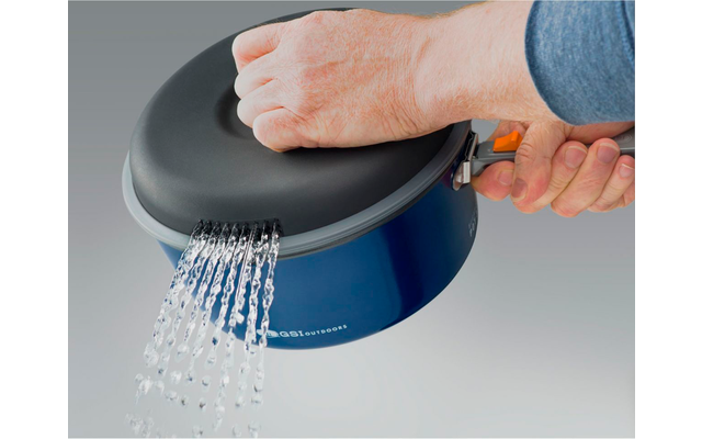 - Inhalt: 5l Topf, 3l Topf, 23 cm Bratpfanne, 2 Siebdeckel, Schneidebrett, zusammenklappbarer Topfgreifer, Packsack