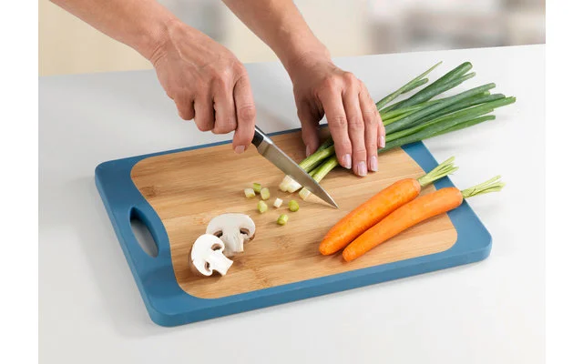 Die antibakterielle Kunststoffseite thermoplastische Elastomere und Silberphosphatglas eignet sich hervorragend als Tranchier- und Schneidbrett für Fisch, Fleisch und Zwiebeln, die Bambusseite für Gemüse, Früchte, Käse oder Gebäck.