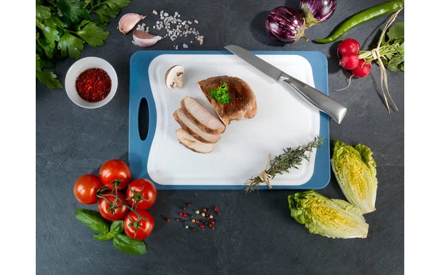 Besonders genial: Das hygienische Brett hat zwei unterschiedliche Seiten.