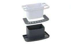 Im Behälter findet das Geschirrspülmittel einen festen Platz. Und seitlich ist ausreichend Stauraum für Schwämme, Spülbürste & Co. Besonders praktisch ist das umlaufende, abnehmbare Abtropfgitter – speziell zum Ablegen nasser Schwämme.